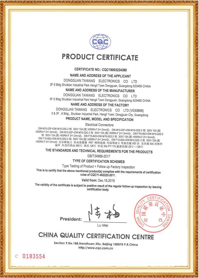 防水連接器CQC證書